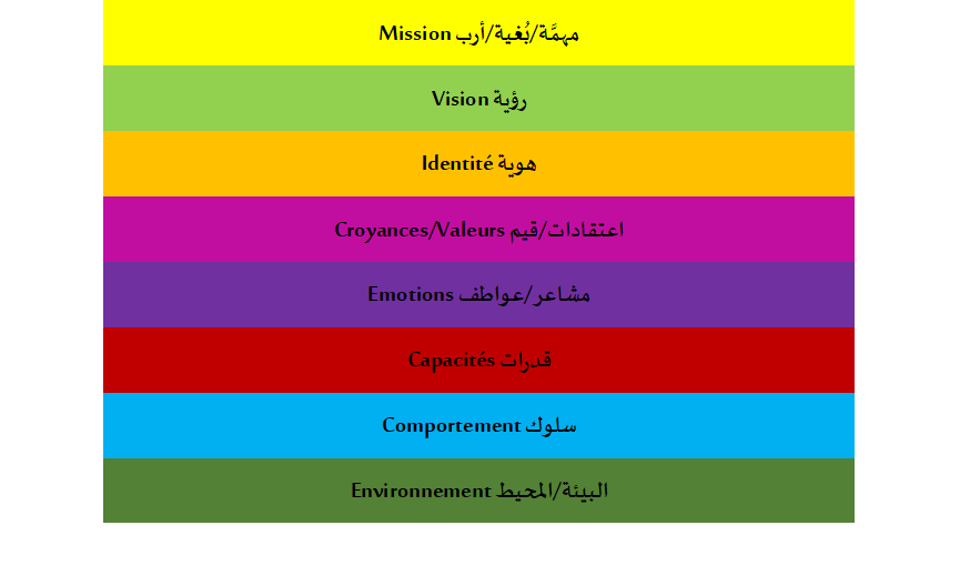 عندما ننظر بتمعُّن و قوة ملاحظة إلى هذه المستويات المنطقية للفكر نُدرك، مثلا، بأنها ليست البيئة التي ستُرضي قِيَمَنا بل هي الهوية، “من أنا؟”، هل أنا إنسان رائع؟ عظيم أو استثنائي؟ و إنها اعتقاداتنا التي تؤثر على مشاعرنا و عواطفنا. و مهمَّتُنا، بُغيتُنا هي التي تَحُلُّ كل باقي المستويات. بعبارة أخرى، إذا أخذت، على سبيل المثال، على أن بُغْيَتي و أربي هو أن أكون رجلا مُحباًّ لزوجتي؛ إذن ستكون رؤيتي المثالية للعيش كزوجين هي التوافق التام على جل المستويات. و ستكون القيم التي أدافع عنها و أتبنَّاها هي: التواصل، التواطؤ، الأسرة، العطف و الحنان، الحب… و طالما أني أشارك كل هذا مع زوجتي، فأنا زوج محبٌّ و بالتالي تتم تلبية و إرضاء جميع قيمي؛ و أعتقد أني شخص جيد، و من تم، فأنا حتماً بخير و لدي القدرة الكاملة لتنفيذ مهمتي و لي سلوك محبٌّ و زوجتي سعيدة.