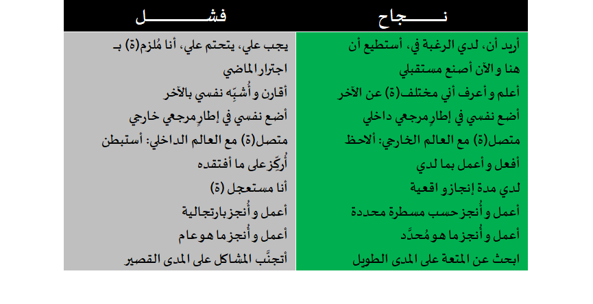 إنه من الأفضل أن نقول “أريد” عوض “يجب علي”. يجب الإنتباه جدّاً إلى القوة الخلاَّقة للكلمات، من الأحسن أن نكون في طاقة: الآن و هنا، بدلاً من اجترار الماضي بصفة مستمرة دون جدوى. إنه أيضاً أكثر فائدة أن نقول و نعرف أننا مختلفون عن الآخرين عوض الاستمرار في مقارنة أنفسنا بهم. و بالمثل، من المثير للإهتمام أن نفعل الأشياء بأنفسنا عوضاً من السماح أو مطالبة الآخرين القيام بها نيابة عنا. و الذي يركِّز كل طاقته و اهتمامه بنرجسيةٍ على “شخصه الصغير” سيكون، حتماً، أقل كفاءةً من الذي يوجِّه ذلك نحو الملاحظة. و نوظِّفُ ما لدينا عوض البحث و التركيز على ما هو غير متاح و مفتقد هو أكثر إعانة لنا بدون شك. كذلك، إن القيام بالأشياء بسرعة و عُجالة هو أقل جدارة و صلاحيةً بكثير، مقارنةً مع أخذ الوقت الكافي و التأنِّي في ذلك. و بطبيعة الحال، فبناء و تنفيذ مشروع معين مرحلة بعد الأخرى و حسب مخطط و مساطرَ واضحةٍ هو أكثر و أحسن نجاعة و كفاءة من تحقيقه اعتمادا على الإرتجالية.