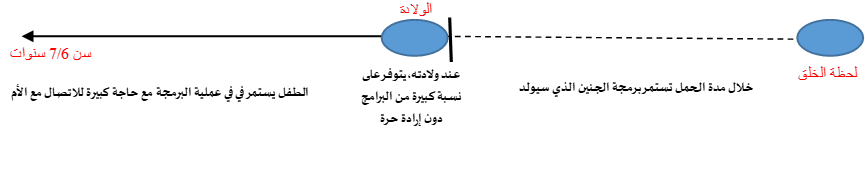 إذن، فالشخص منذ لحظة الخلق الأولى إلى حدود لحظة الولادة، أي كل مدة الحمل الطبيعية، يكون في وضعية برمجة مُسبقة و عندما يولد يكون متوفراً على نسبة من البرمجة و لكن القليل جدا من الإرادة الحرة. و من الولادة حتى سن السادسة أو السابعة يستمر الطفل في أخذ و تلقي البرامج و البرمجة مع حاجة كبيرة و مُلِحَّةٍ لديه لإبقاء اتصال دائم بالأم.